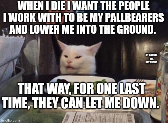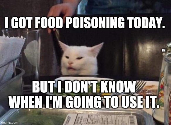 White cat at dinner table meme